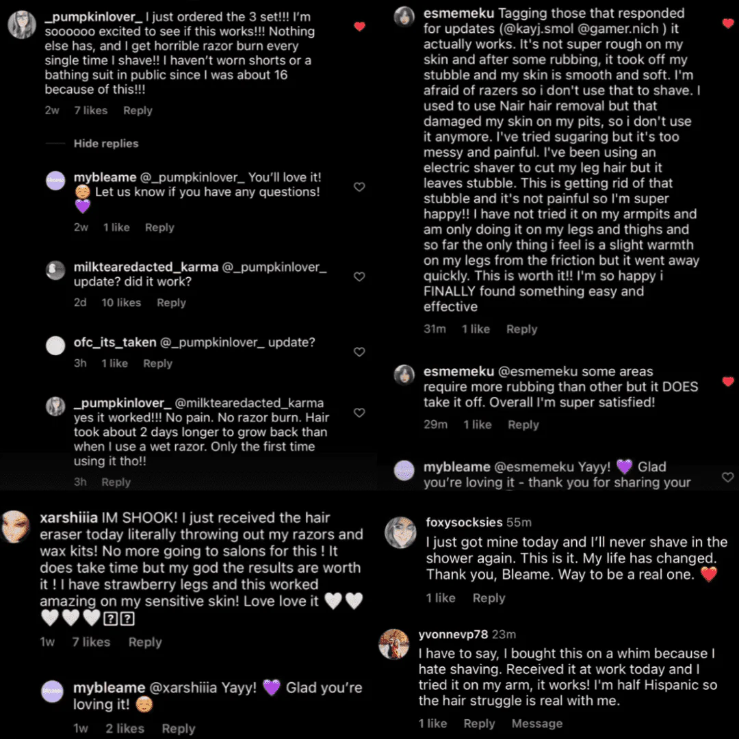 We love our Bleame™ Crystal Hair Eraser and are confident you will too! That’s why we’re offering a 30-Day Guarantee. If you’re not satisfied, we’ll be happy to review your case and see how we can help! 💜